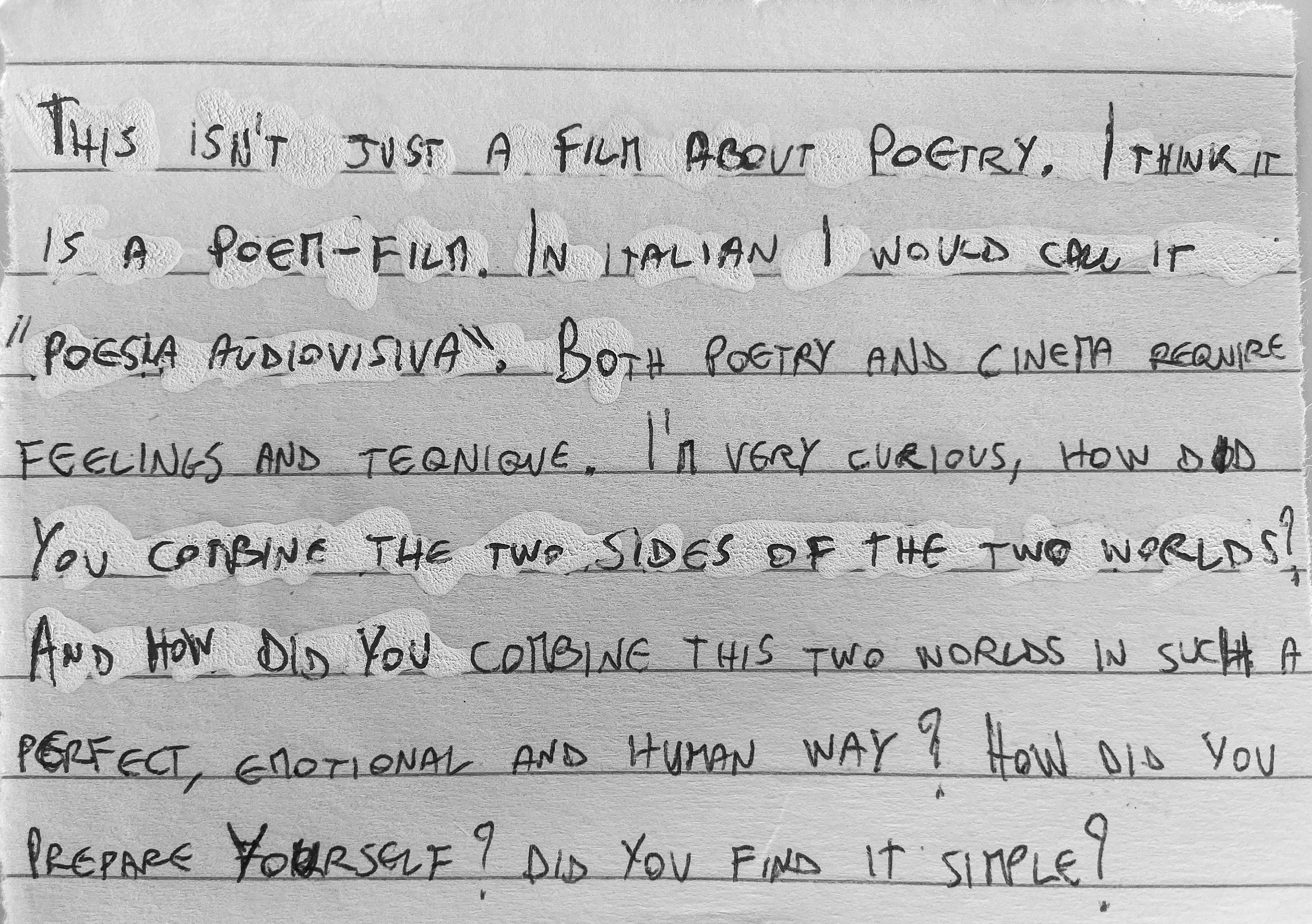 "The lyrical flow of the images is so intense, the shooting is fantastic, the subject matter so heartfelt. Your camera style is so intimate and respectful and lyrical. The editing is crazy good, feels like you worked on this a long time. It's a very powerful work."
